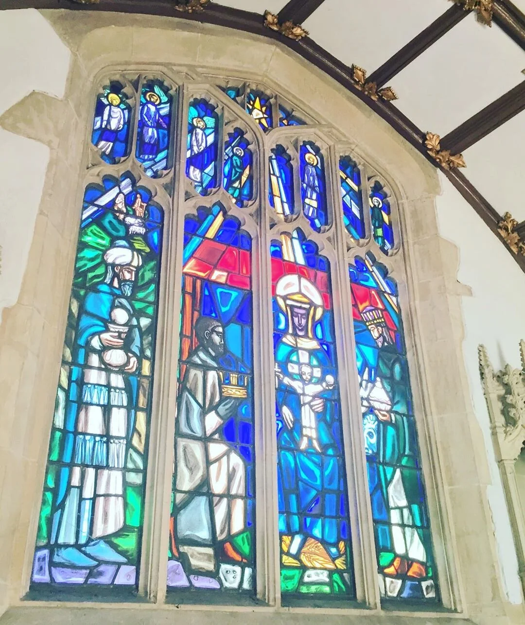 The stained glass window depicting the Three Wise Men was designed by celebrated stained glass artist Patrick Pollen (1928-2010), and was installed in 1963. The external statues were installed in the 1960s and designed by Ernest Pascoe (1922-1996), who later became Chair of the Royal West of England Academy.